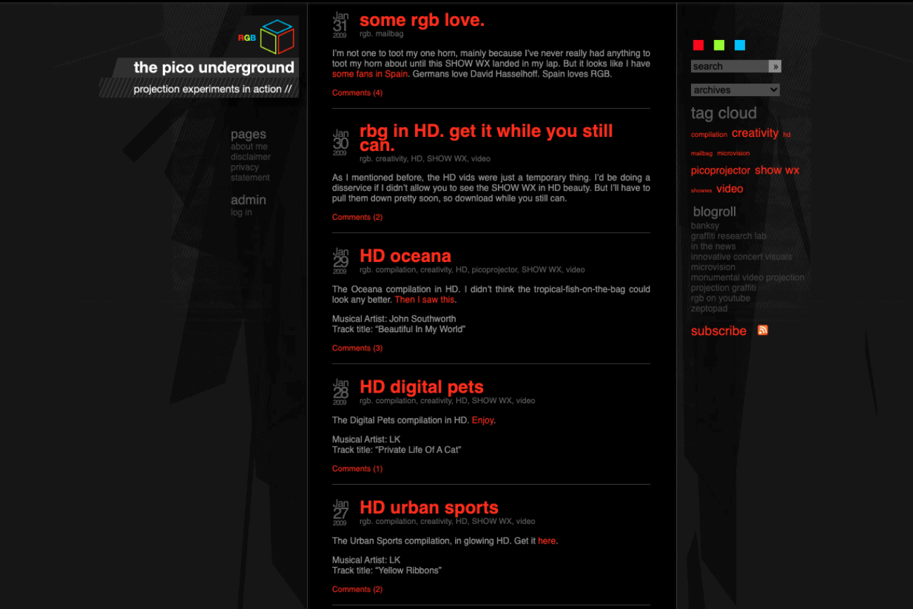 The character, RGB, loves technology and his role at Microvision. He feels compelled to run experiments and document the results to share with the world. A handheld laser-based Pico Projector is a new technology ready to meet an unsuspecting world. RGB brings it. His exploits are shared on his personal blog, The Pico Underground.